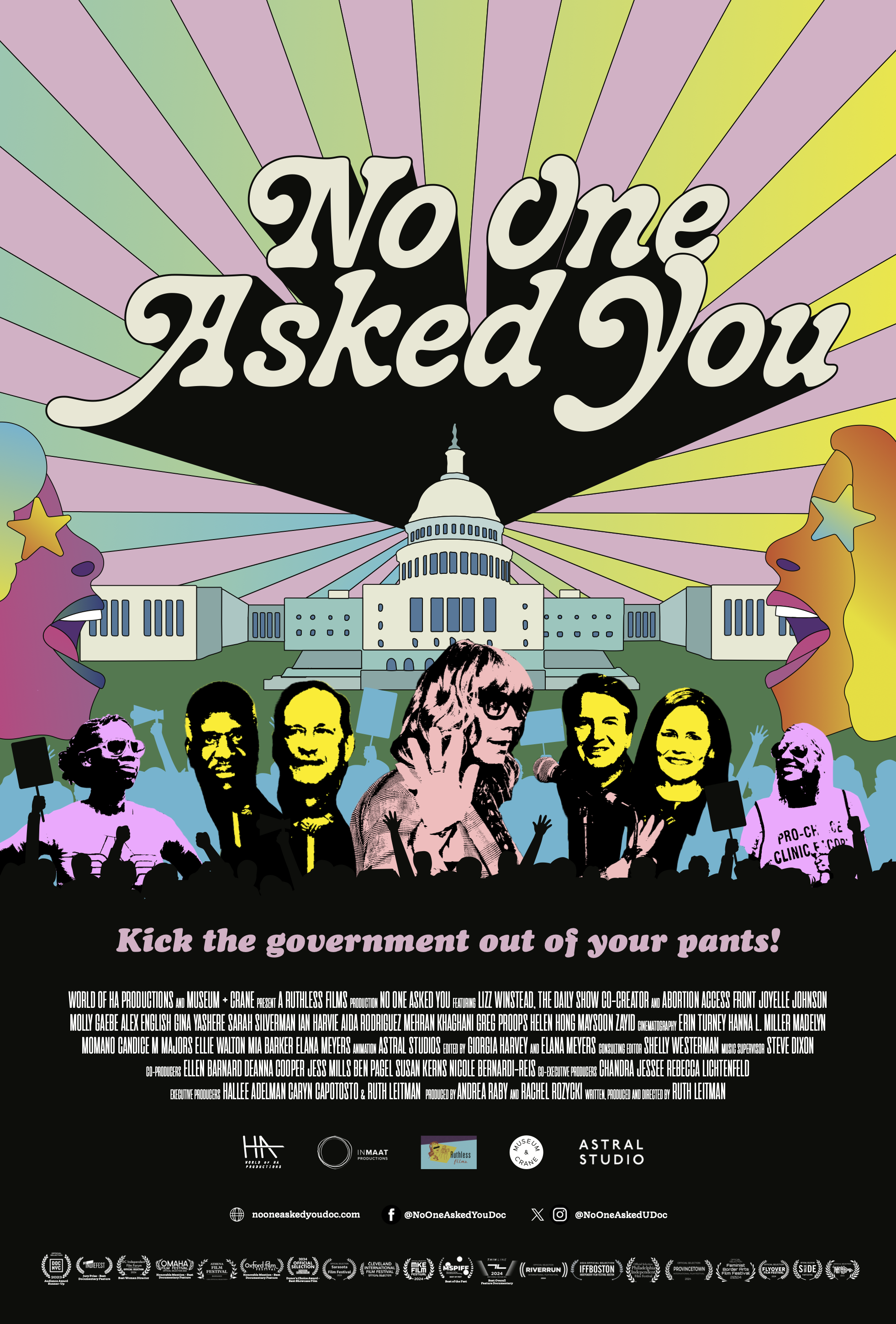 About the film: Comedian and disruptor-extraordinaire Lizz Winstead (co-creator of The Daily Show) and Abortion Access Front crisscross the U.S. to support abortion clinic staff and bust stigma. Pop culture icons and next-gen comics fuel this six-year road film, activating small-town folks to rebuild vandalized clinics and exposing wrongdoer politicians, anti-abortion extremists, and media neglect as the race to the bottom ensues and our rights burn down. No One Asked You is a bold call to action driven by the power of humor in social change, where joy prevails.